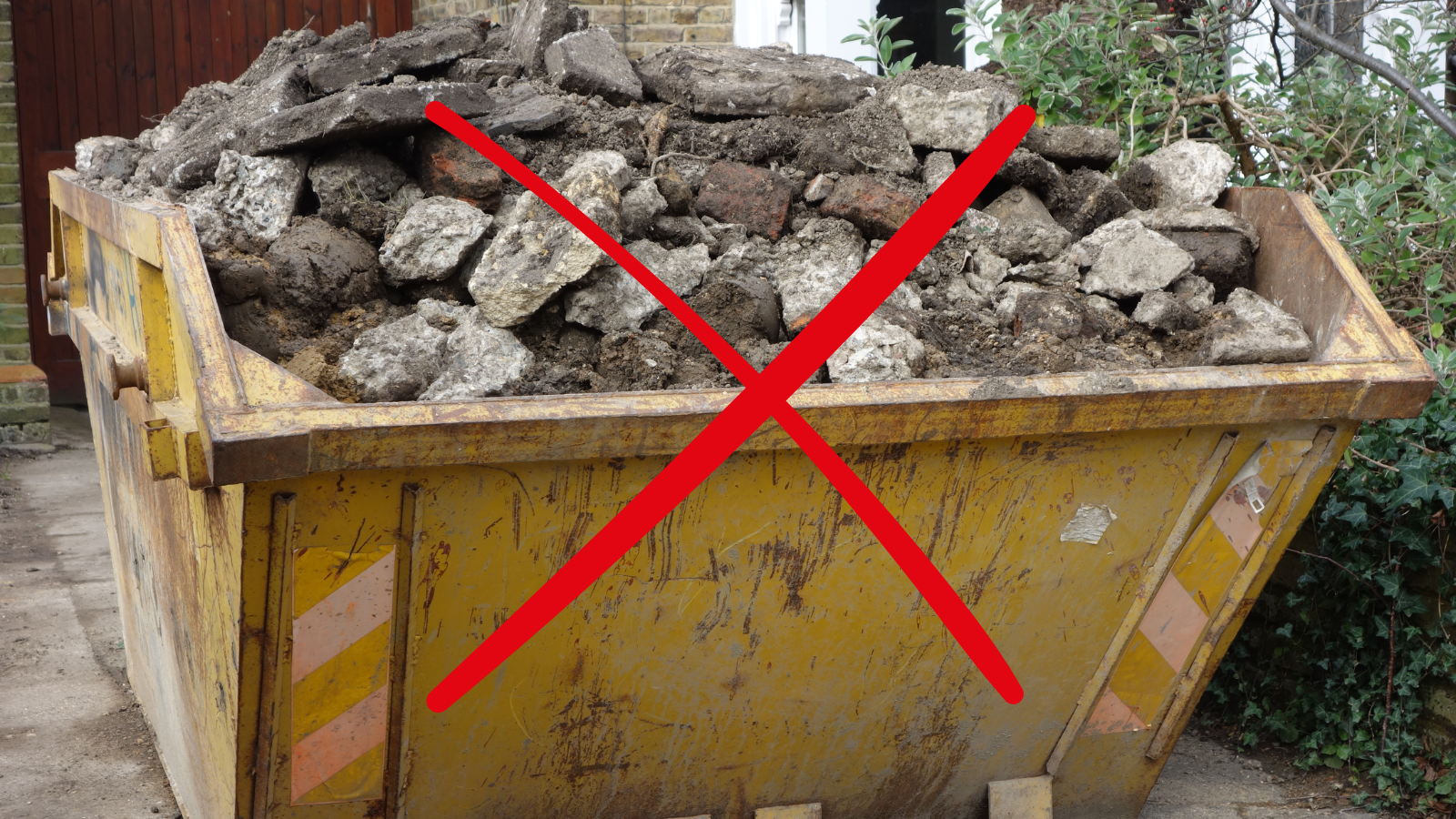 1. No full loads of soil, clay, stone, concrete, rubble, or plasterboard in our largest skips. They are designed for mixed waste only.